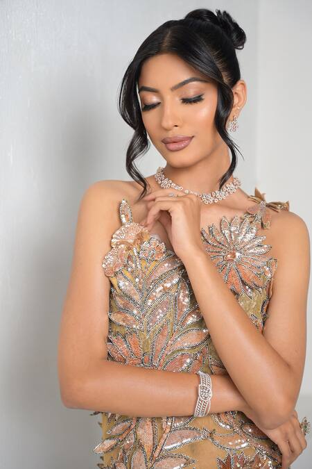 Gold Net Embroidered Sequin One-shoulder Floral Cutwork Gown