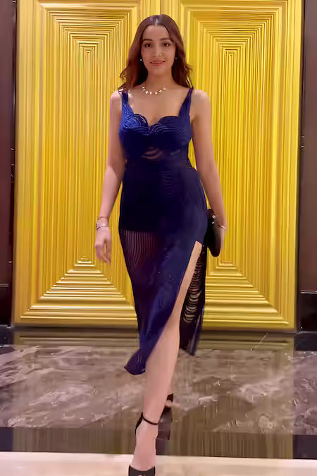 Ink blue midi dress with cutdana embroidery in stripe pattern.