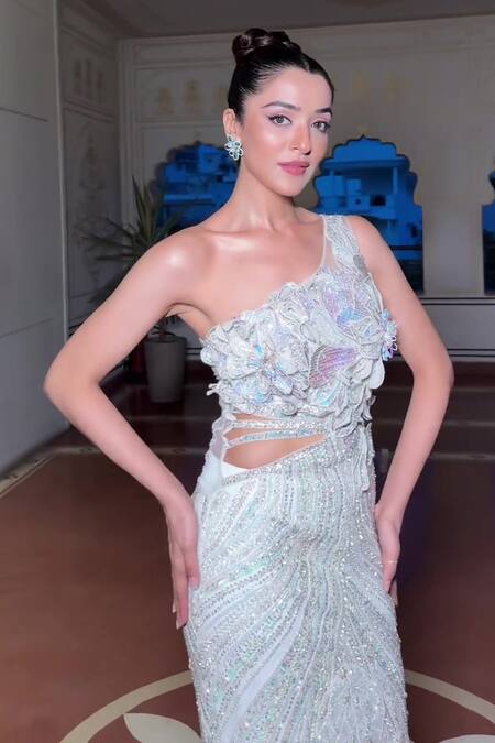Ivory gown in 3D sequin floral embroidered bodice with leaf cutout sequin work trail. Comes with inner mini skirt.